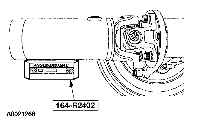 7. To check the engine angle, rotate the driveshaft so that the slip yoke ear is parallel to the floor. Remove the U-joint snap ring, then install the special tool. Check and record the engine angle reading.