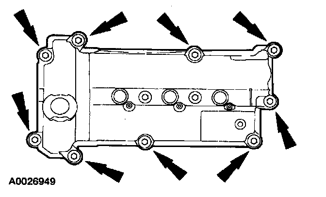 2. Apply a 5 mm dot of silicone gasket and sealant to the front cover to cylinder head joints.