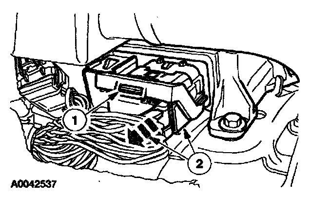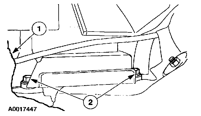 WARNING: The restraints control module (RCM) orientation is critical for correct air bag supplemental restraint system (SRS) operation. If a vehicle equipped with an SRS system has been involved in a collision in which the center tunnel area has been damaged, inspect the mounting and bracket for deformation. If damaged, a new RCM must be installed whether or not the air bags have deployed. In addition, make sure the area of the RCM mounting is restored to its original condition.