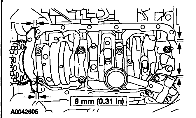 2. Apply a bead of silicone gasket and sealant in two places where the cylinder block meets the front cover and in two places where the rear main bearing cap meets the cylinder block.
