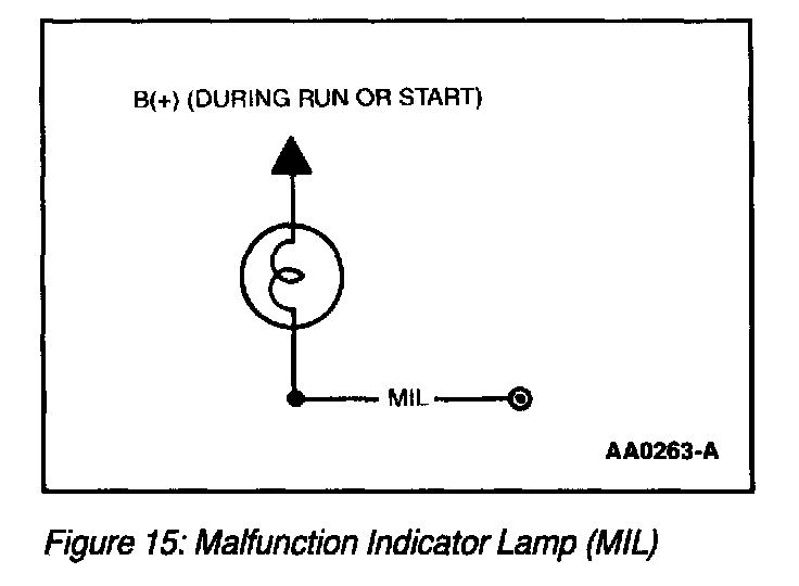 The Malfunction Indicator Lamp (MIL) (Figure 15) alerts the driver that the Powertrain Control Module (PCM) has detected an On Board Diagnostic (OBD) II emission-related component or system fault. When this occurs, an OBD II Diagnostic Trouble Code (DTC) will be set.