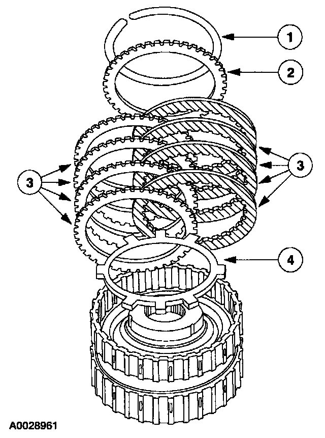 2. CAUTION: Do not fully compress the Intermediate clutch spring retainer. Using the special tool, compress the intermediate clutch return spring and remove the snap ring.