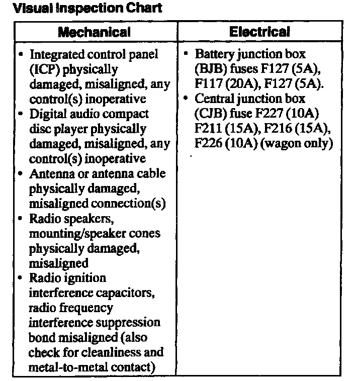 1. Verify the customer concern by operating the electronic audio system with the engine running and the vehicle in and out of motion.Visual Inspection Chart: