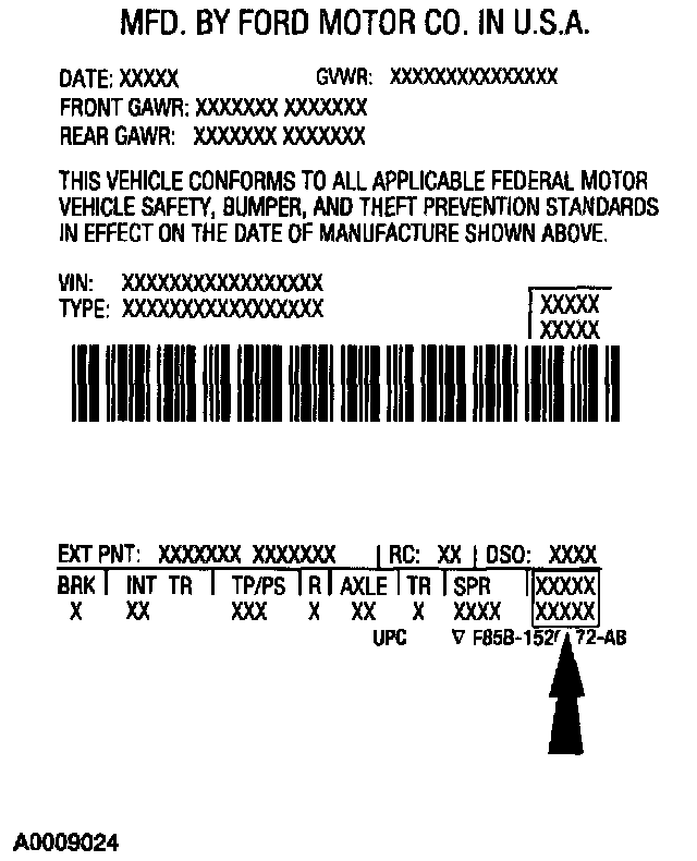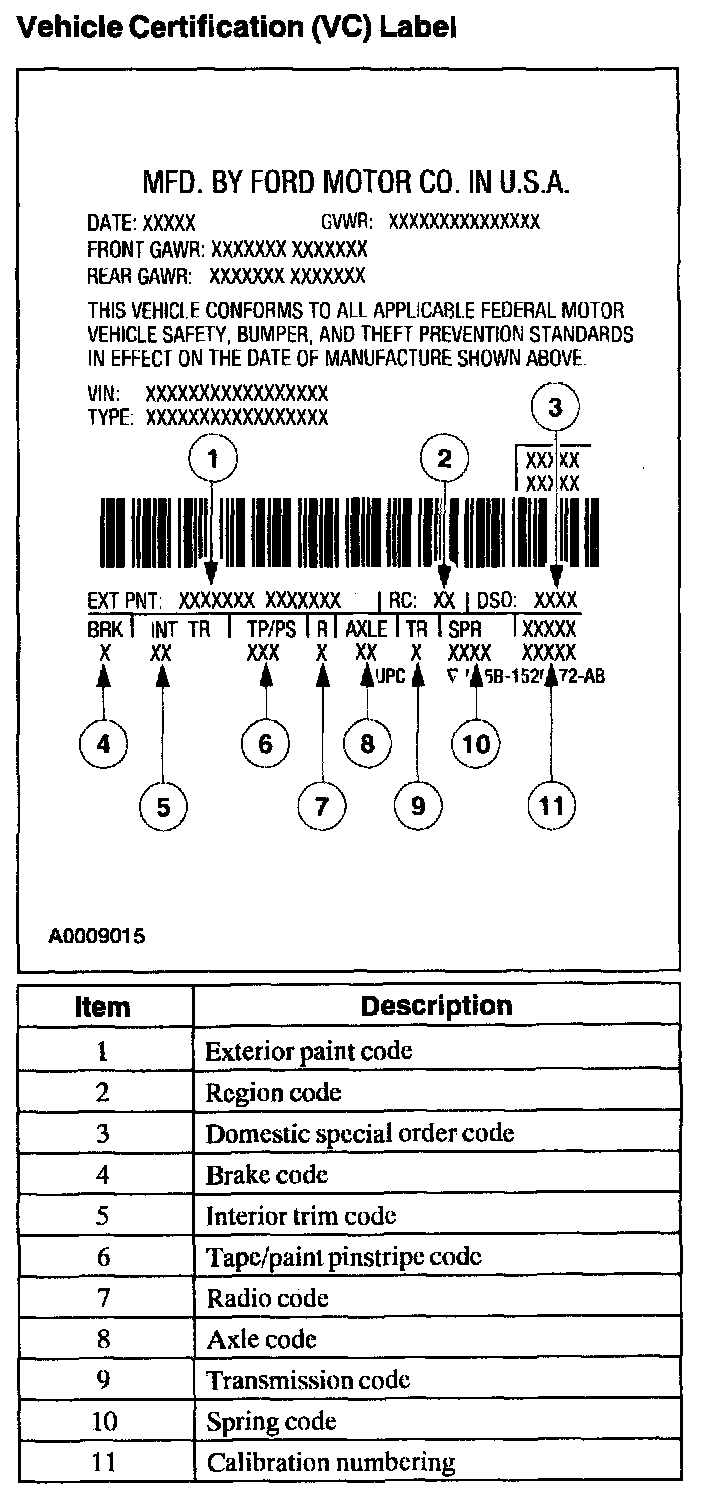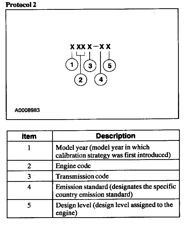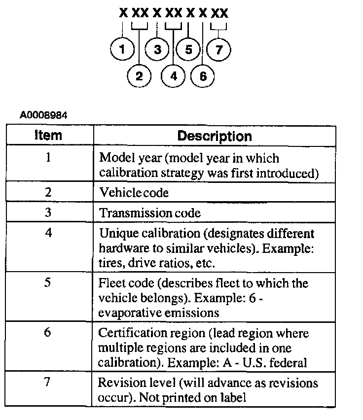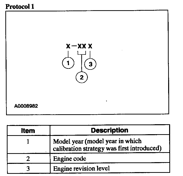 Powertrain calibration information is printed in the lower right corner of the Vehicle Certification Label. Only the base calibration information is printed. Revision levels will not appear, however, they can be found in On Line Automotive Service Information System (OASIS). For the current model year, Ford Motor Company is using three different protocols which describe powertrain base calibration. These protocols are designed to provide worldwide standardization for vehicle calibration. If the electronic calibration strategy has been used since 1998 and carried into the current model year, Protocol 1 will be used. Refer to Protocol 1. If the electronic calibration strategy has been used since 1999 and is carried into the current model year, Protocol 2 will be used. Refer to Protocol 2. For electronic calibration strategies introduced in 2000 or later model years, Protocol 3 will be used. Refer to Protocol 3.