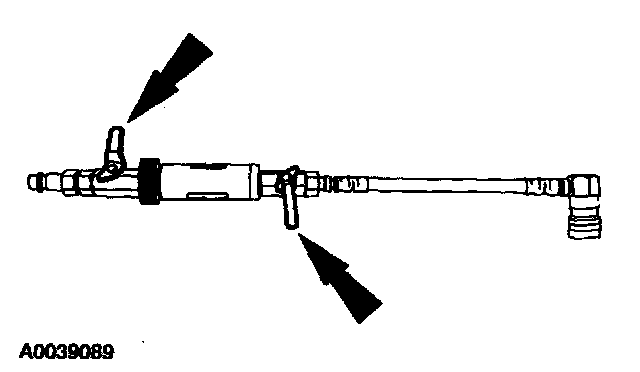 8. Remove the fluorescent dye injector from the low-pressure service gauge port valve and the R-134a A/C refrigerant service center or manifold gauge set.