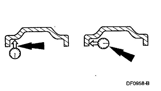 Using a suitable runout gauge, measure radial and lateral wheel runout at the positions shown in the illustration. Runout should not exceed specifications. Note that the tire has been removed.