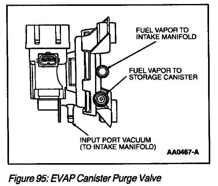 The EVAP canister purge valve (Figure 95) and (Figure 96) is the part of the Enhanced EVAP system that is controlled by the PCM. This valve controls the flow of vapors (purging) from the EVAP canister to the intake manifold during various engine operating modes. The EVAP canister purge valve is normally closed valve.