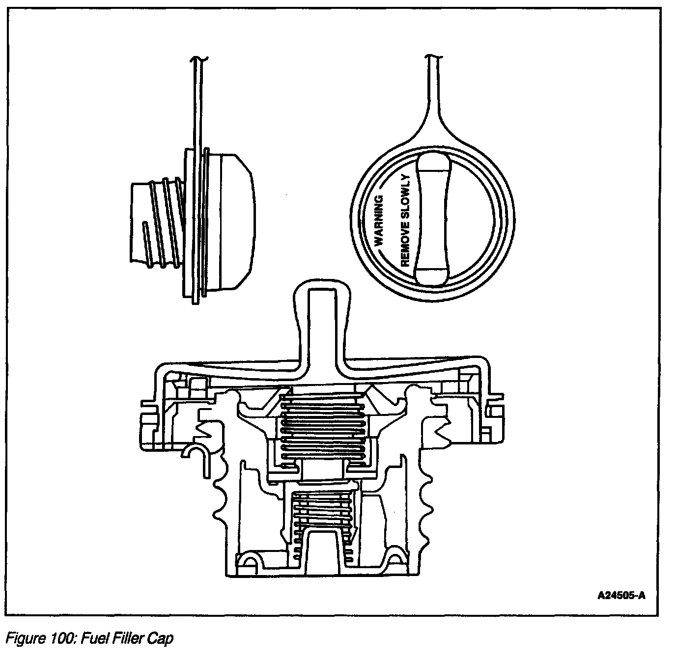 The fuel filler cap (Figure 100) is used to prevent fuel spill and close the evaporative emission/fuel system to atmosphere. Some vehicles may have a Fuel Cap Off Indicator Lamp (FCIL) in the instrument cluster which will illuminate when there is a failure in the vapor management system that may be due to the fuel filler cap not being sealed.