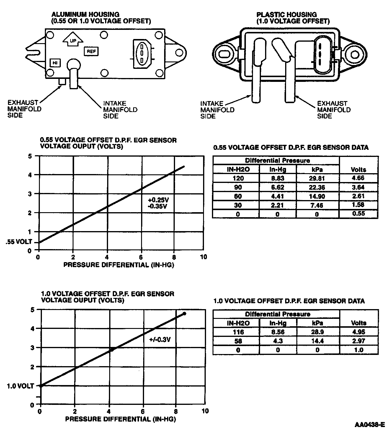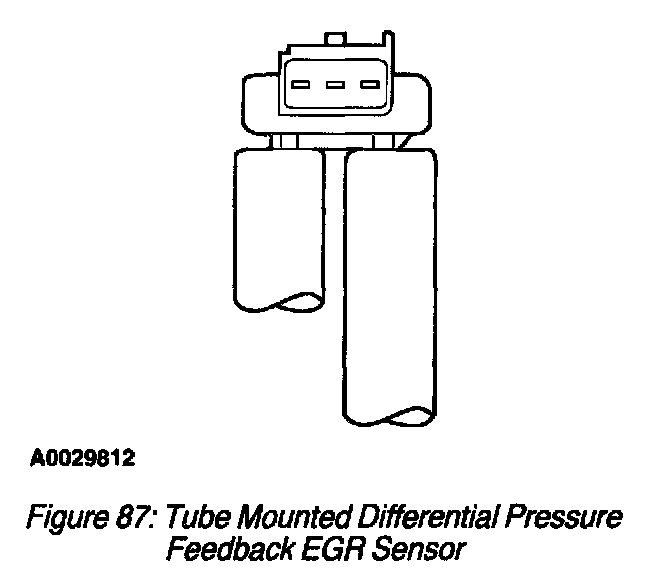 The tube mounted differential pressure feedback EGR sensor (Figure 87) is identical in operation as the larger metal or plastic DPFE sensors and uses a 1.0 volt offset. The HI and REF hose connections are marked on the underside of the sensor.