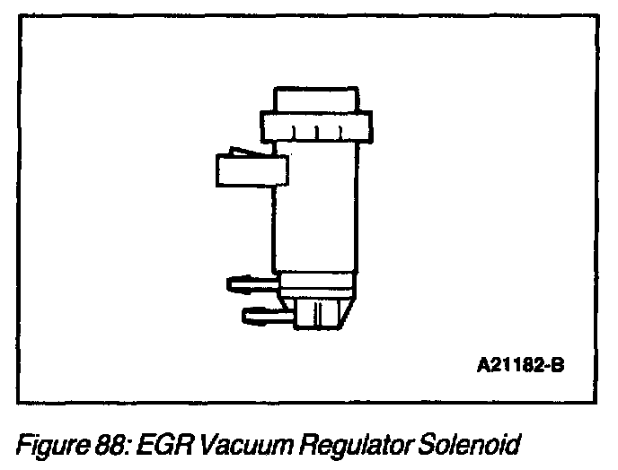 The EGR vacuum regulator solenoid (Figure 88) is an electromagnetic device which is used to regulate the vacuum supply to the EGR valve. The solenoid contains a coil which magnetically controls the position of a disc to regulate the vacuum. As the duty cycle to the coil increases, the vacuum signal passed through the solenoid to the EGR valve also increases. Vacuum not directed to the EGR valve is vented through the solenoid vent to atmosphere. Note that at 0% duty cycle (no electrical signal applied), the EGR vacuum regulator solenoid allows some vacuum to pass, but not enough to open the EGR valve.