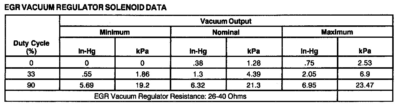 3. The EGR vacuum regulator solenoid receives a variable duty cycle signal (0 to 100%). The higher the duty cycle the more vacuum the solenoid diverts to the EGR valve.