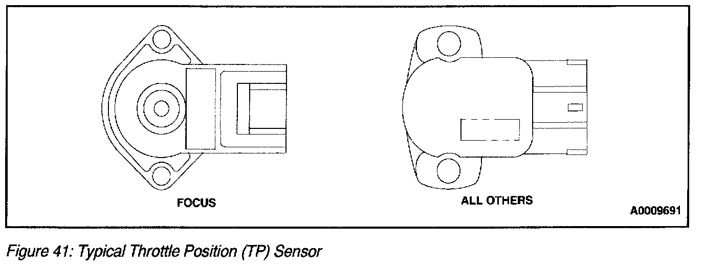 The throttle position (TP) sensor (Figure 41) is a rotary potentiometer sensor that provides a signal to the PCM that is linearly proportional to the throttle plate/shaft position. The sensor housing has a three-blade electrical connector that may be gold plated. The gold plating increases corrosion resistance on terminals and increases connector durability. The TP sensor is mounted on the throttle body. As the TP sensor is rotated by the throttle shaft, four operating conditions are determined by the PCM from the TP. Those conditions are closed throttle (includes idle or deceleration), part throttle (includes cruise or moderate acceleration), wide open throttle (includes maximum acceleration or de-choke on crank), and throttle angle rate.