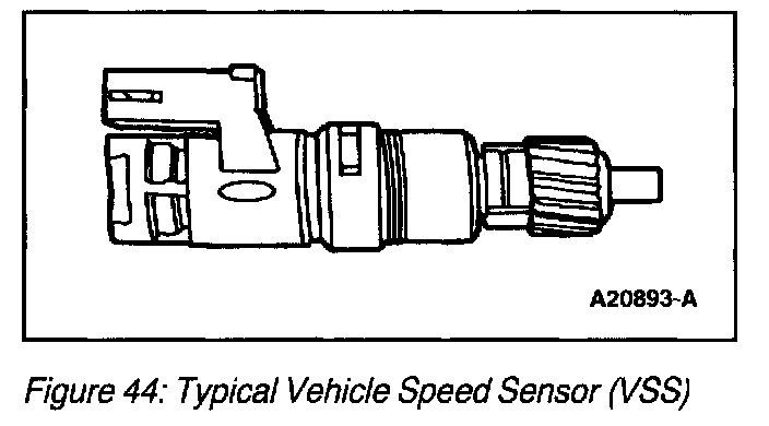 The Vehicle Speed Sensor (VSS) (Figure 44) is a variable reluctance or Hall-effect sensor that generates a waveform with a frequency that is proportional to the speed of the vehicle. If the vehicle is moving at a relatively low velocity, the sensor produces a signal with a low frequency. As the vehicle velocity increases, the sensor generates a signal with a higher frequency. The PCM uses the frequency signal generated by the VSS (and other inputs) to control such parameters as fuel injection, ignition control, transmission/transaxle shift scheduling and torque converter clutch scheduling.