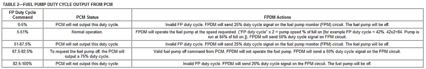 The Fuel Pump (FP) signal is a duty cycle command sent from the powertrain control module (PCM) to the fuel pump driver module (FPDM) (Table 2). The FPDM uses the FP command to operate the fuel pump at the speed requested by the PCM or to turn the pump off.