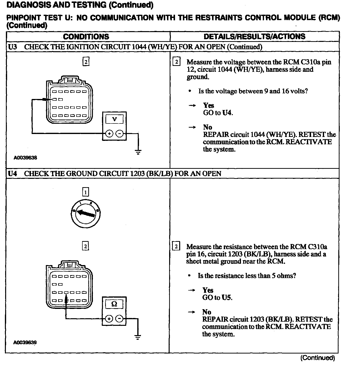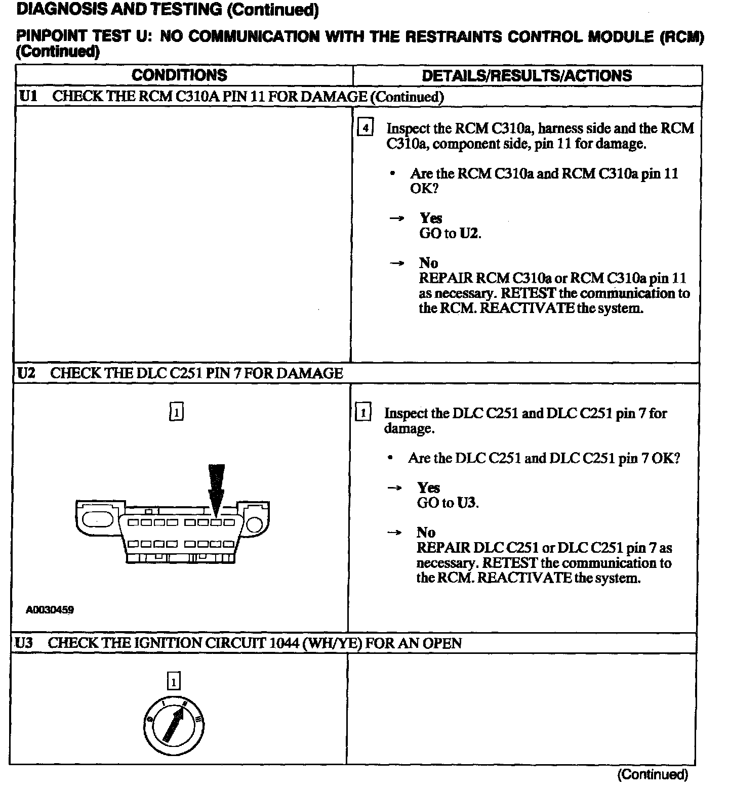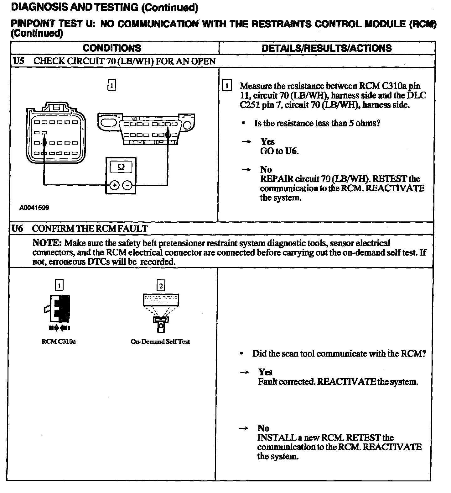 The scan tool Communicates with the Restraints Control Module (RCM) monitors through the Data Link Connector (DLC) C251 pin 7, 70 (LB/WH).