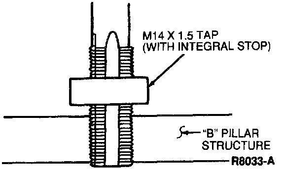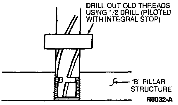 2. Use the half-inch drill with integral stop provided in D-Ring Installation Kit to drill out the damaged threads in the weld nut(s) in the upper pillar structure.
