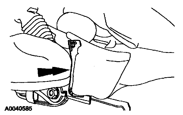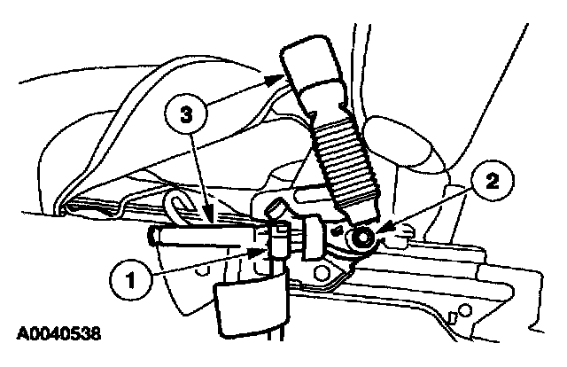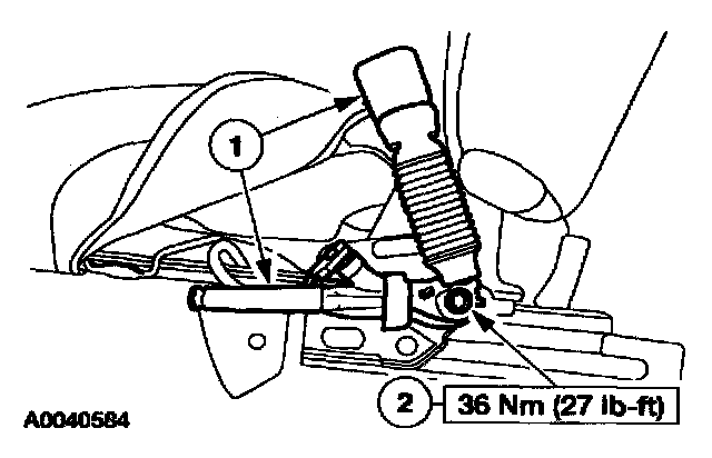 ^ Align the safety belt buckle and pretensioner mounting bracket slot so that the seat track bracket anti-rotation tab goes through it.