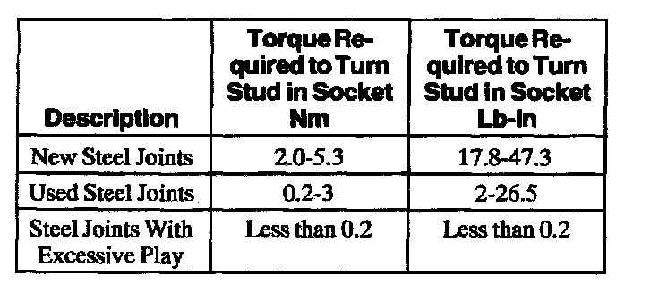 Steel, greaseable joints can be checked for excessive wear by measuring the torque it takes to tam the stud.
