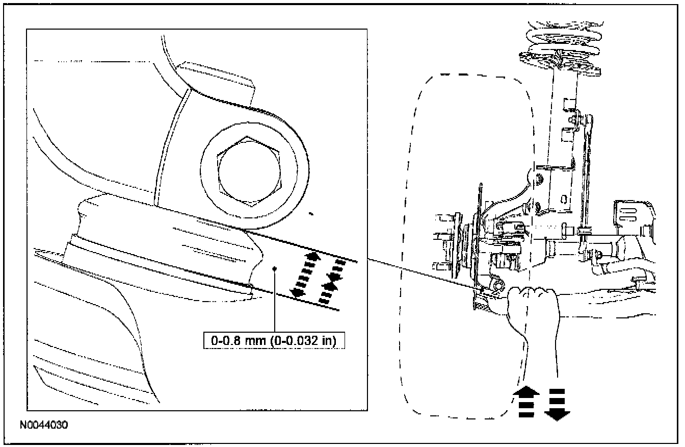 4. CAUTION: Do not use any tools or equipment to move the wheel and tire assembly or suspension components while checking for relative movement. Suspension damage can occur. The use of tools or equipment will also create relative movement that may not exist when using hand force. Relative movement must be measured using hand force only.