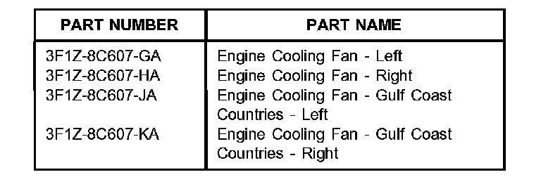 2. If diagnosis determines either the RH, LH or both Cooling Fans exhibit excessive vibration/shake, replace the appropriate cooling fan(s). Removal and reinstallation of the Cooling Fan Assembly can be found in Section 303-03 of the appropriate model year Workshop Manual.