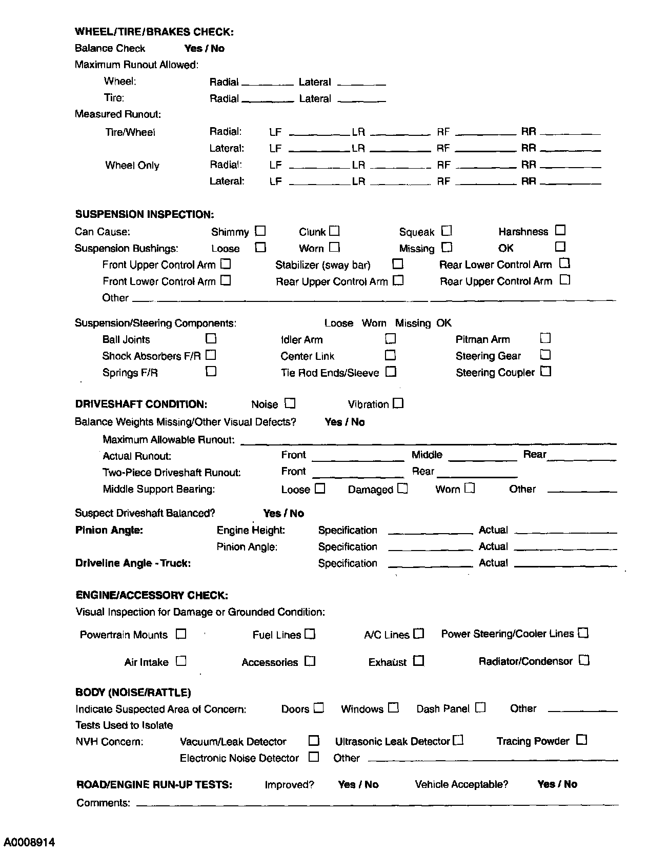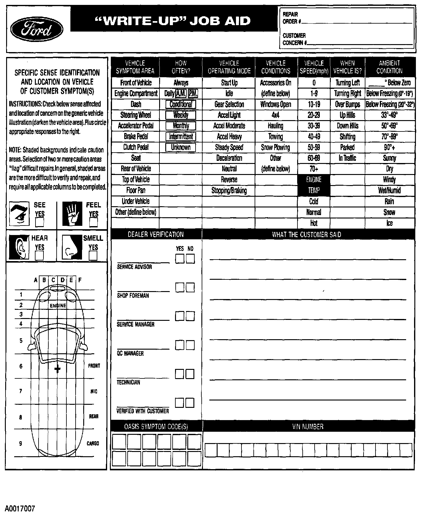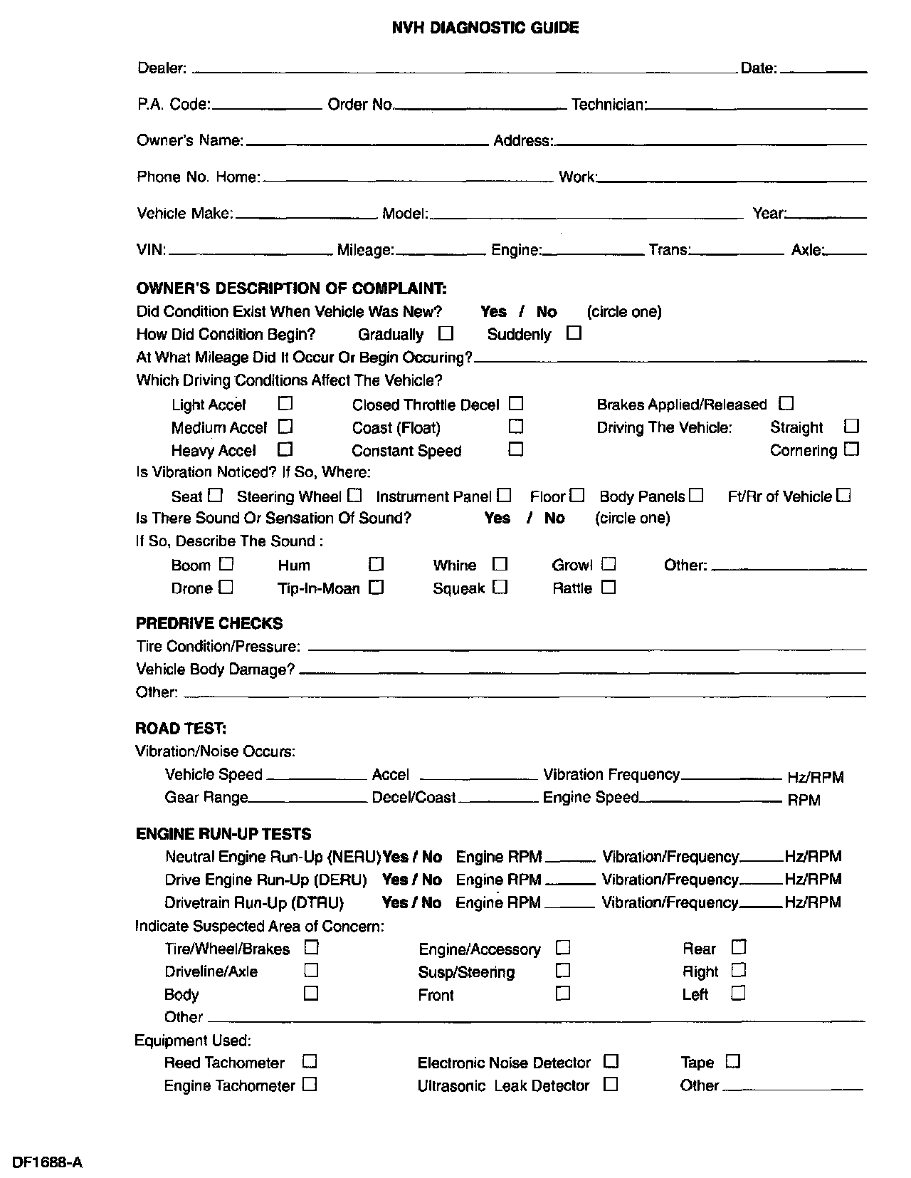 To assist the service advisor and the technician, a Write-up Job Aid and an NVH Diagnostic Guide are included with this material. The Write-up Job Aid serves as a place to record all important symptom information. The NVH Diagnostic Guide serves as a place to record information reported on the Write-up Job Aid as well as data from the testing to be carried out.