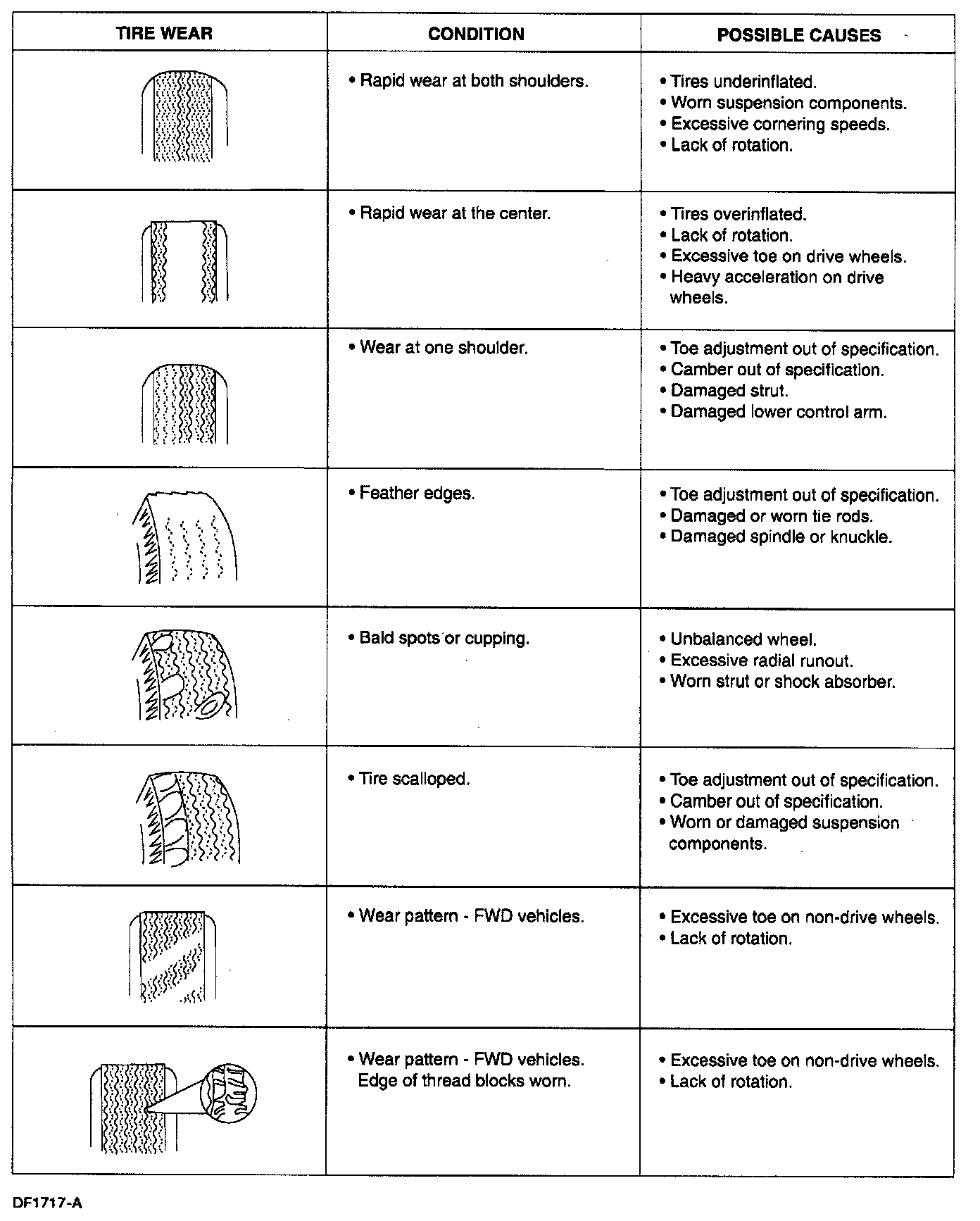 Careful attention must be paid to the tire and wheels. There are several symptoms that can be caused by damaged or worn tire and wheels. Carry out a careful visual inspection of the tires and wheel assemblies. Spin the tires slowly and watch for signs of lateral or radial runout. Refer to the tire wear chart to determine the tire wear conditions and actions.