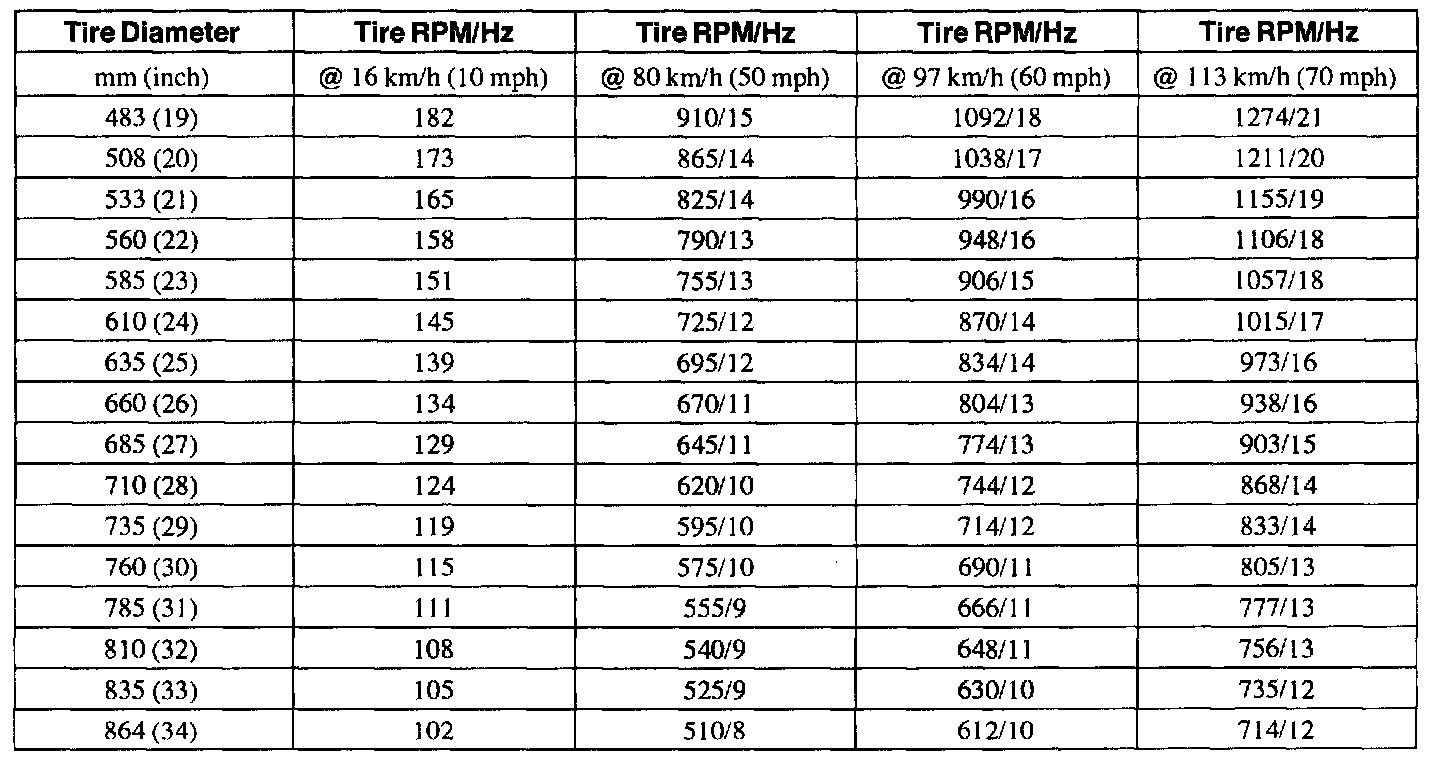^ Obtain the corresponding tire and wheel rpm and frequency from the Tire Speed and Frequency Chart.