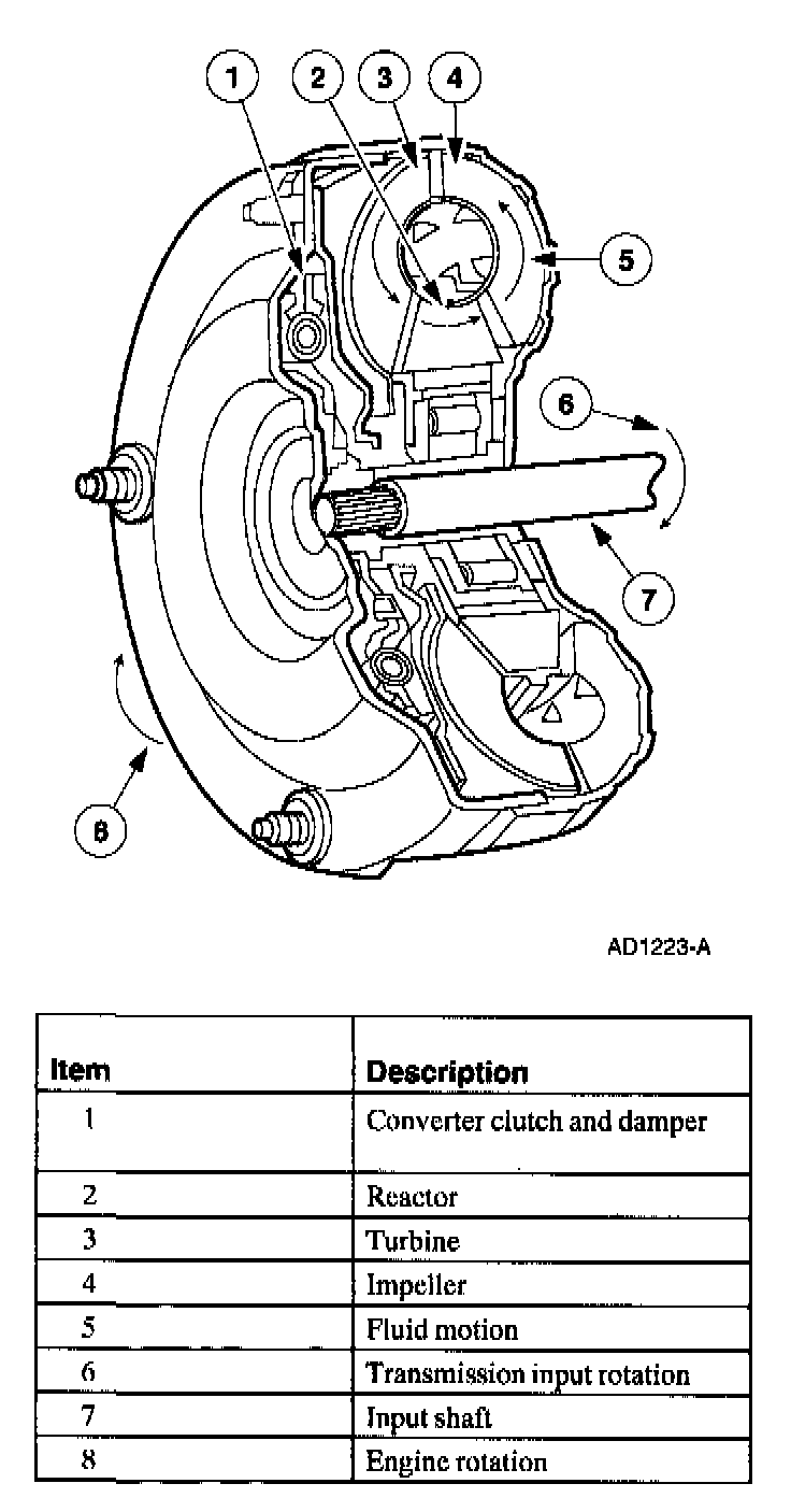Torque ConverterThe torque converter transmits and multiplies torque. The torque converter is a four-element device: