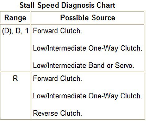 If stall speeds were too high see the stall speed diagnosis chart. If stall speeds were too low first check engine idle speed and tune up. If engine is OK remove torque converter and check torque converter clutch for slippage.