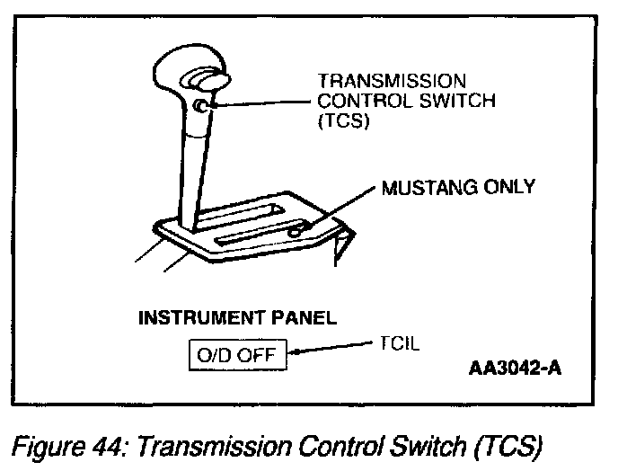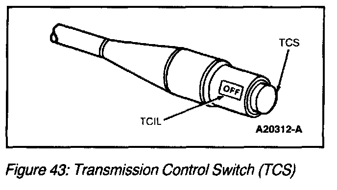 The Transmission Control Switch (TCS) (Figures 43 and 44) signals the PCM with key power whenever the TCS is pressed. On vehicles with this feature, the Transmission Control Indicator Lamp (TCIL) lights when the TCS is cycled to disengage overdrive. The operator of the vehicle controls the position of the TCS.