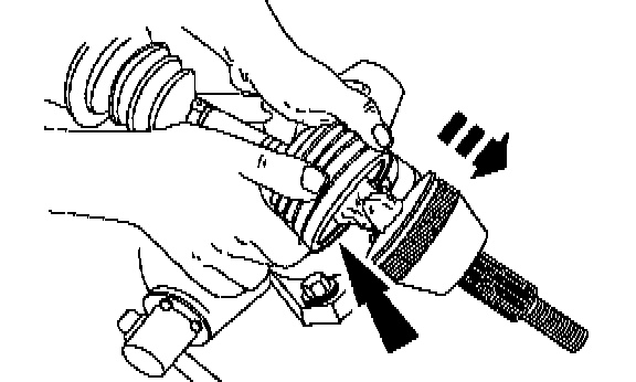 Using a non-metallic hammer, tap the front wheel driveshaft joint onto the interconnecting shaft. Make sure the front wheel driveshaft joint has locked on the interconnecting shaft by attempting to pull the joint off of the shaft.