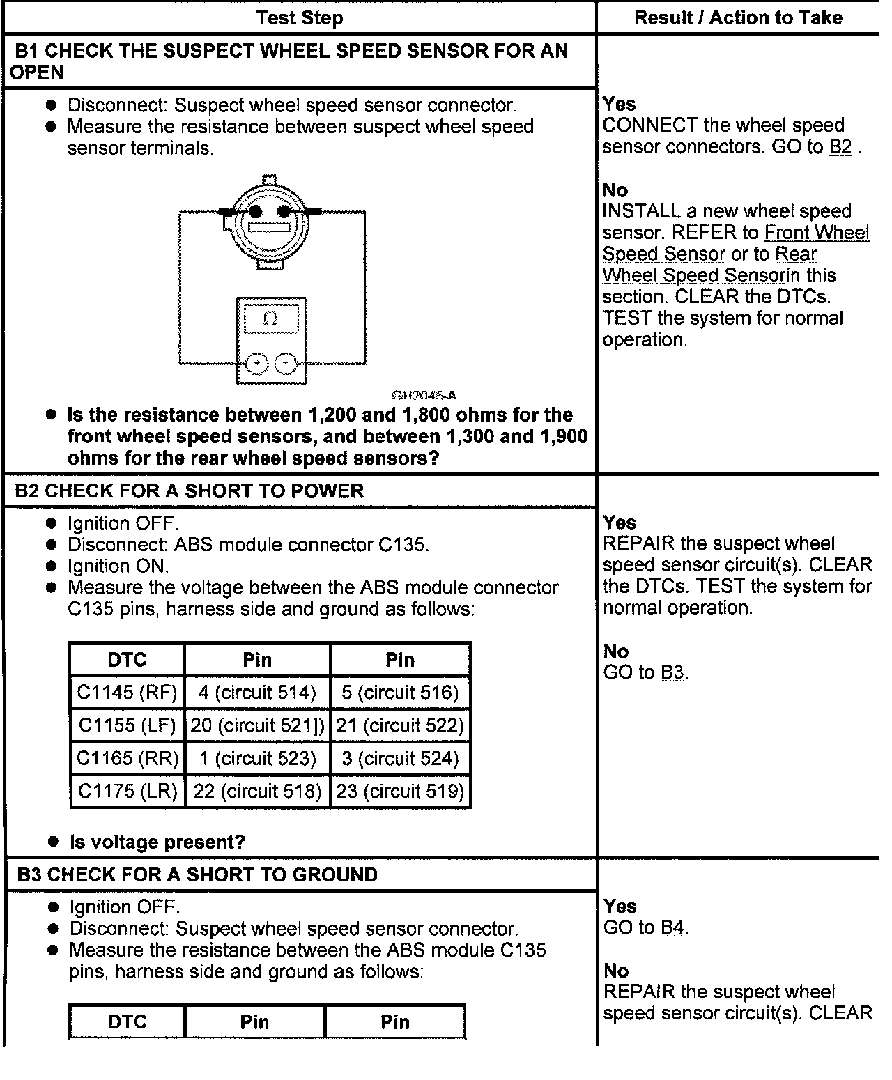 PINPOINT TEST B: DTC C1145 (RF), DTC C1155 (LF), DTC C1165 (RR),