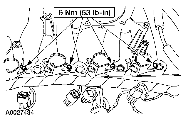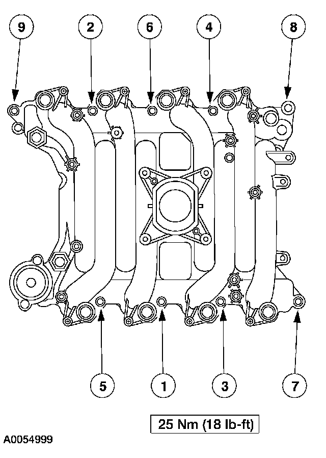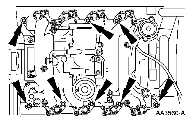 51. Install the intake manifold and hand-tighten the bolts at the locations shown.