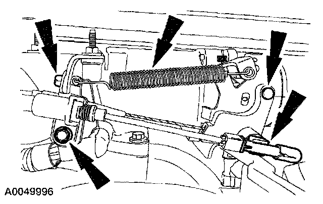 12. Remove the bolts, the return spring, and disconnect the accelerator and speed control cables.