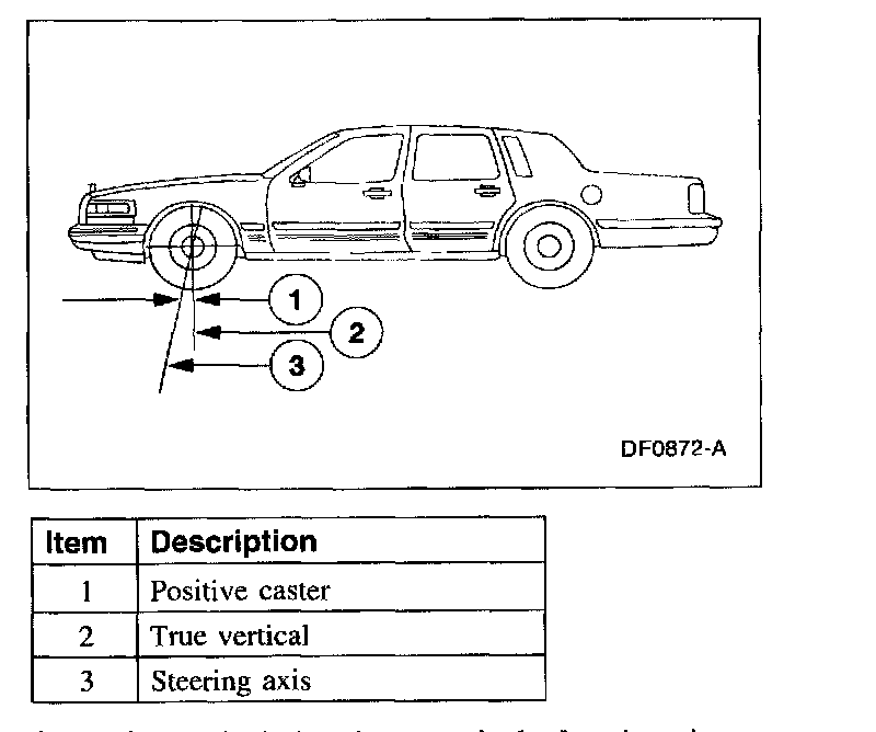Caster is the deviation from vertical of an imaginary line drawn through the ball joints when viewed from the side. The caster specifications in this section will give the vehicle the best directional stability characteristics when loaded and driven. The caster setting is not related to tire wear.