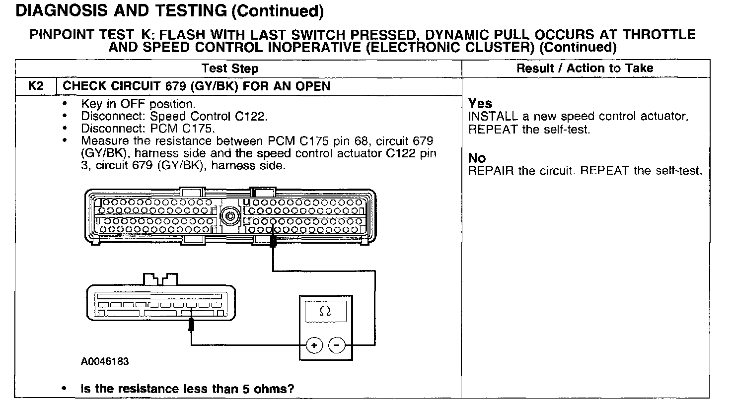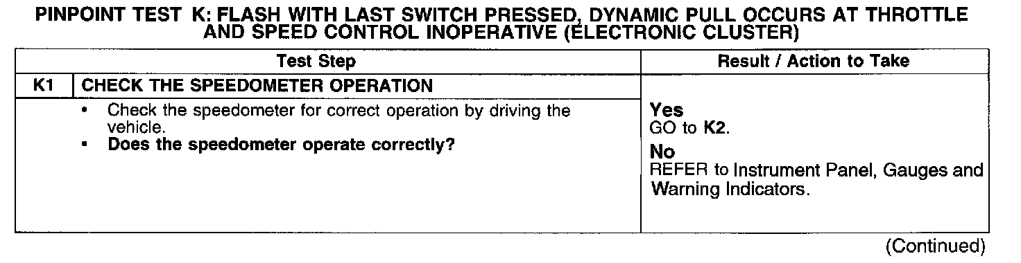 PINPOINT TEST K: FLASH WITH LAST SWITCH PRESSED DYNAMIC PULL OCCURS AT THROTTLE AND SPEED CONTROL INOPERATIVE (ELECTRONIC CLUSTER)