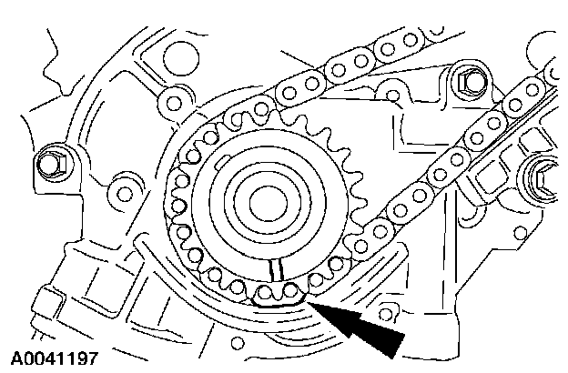 20. Position the RH (outer) timing chain on the crankshaft sprocket, aligning the copper (marked) link with the timing marks on the sprocket.