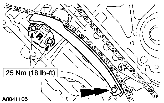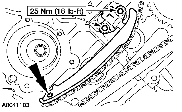 18. NOTE: The LH timing chain tensioner arm has a bump near the dowel hole for identification.