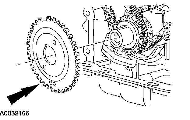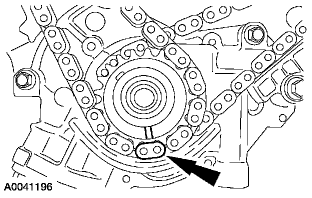16. Position the LH (inner) timing chain onto the crankshaft sprocket, aligning the one copper link on the timing chain with the slot on the crankshaft sprocket.
