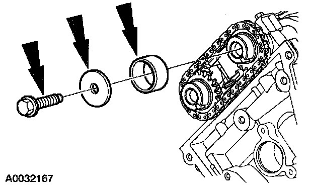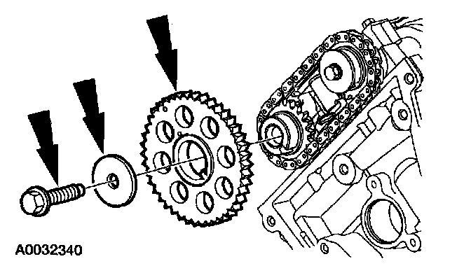 14. Install the camshaft sprocket, washer and bolt, and hand-tighten the bolt.