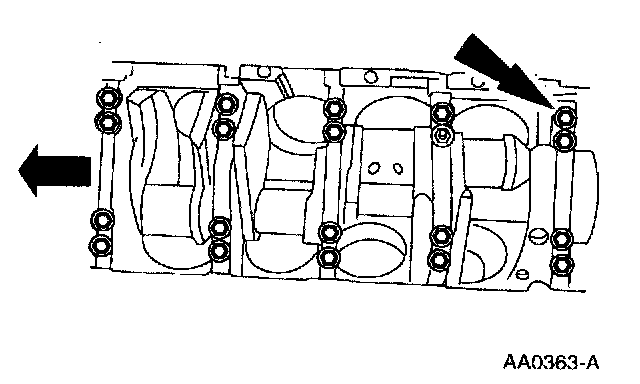 65. Remove the main bearing cap and the crankshaft lower main bearings from the cylinder block.