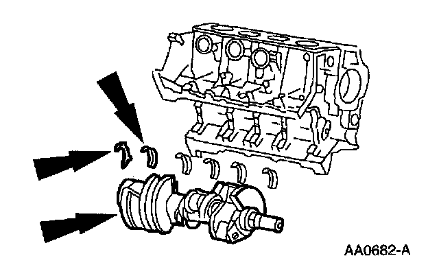 66. Remove the crankshaft, the crankshaft thrust washer, and the crankshaft upper main bearings from the cylinder block.