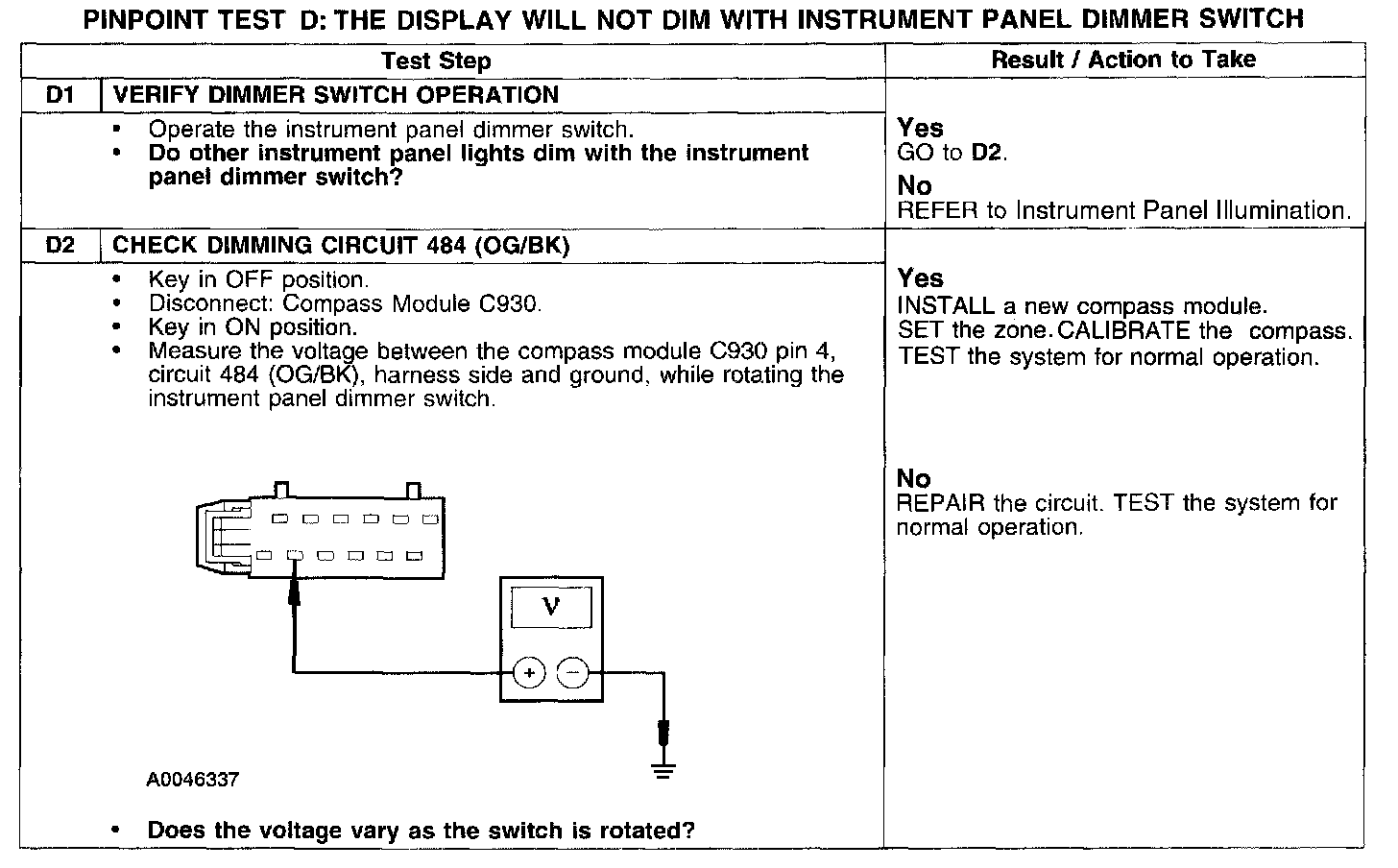 PINPOINT TEST D: THE DISPLAY WILL NOT DIM WITH INSTRUMENT PANEL DIMMER SWITCH
