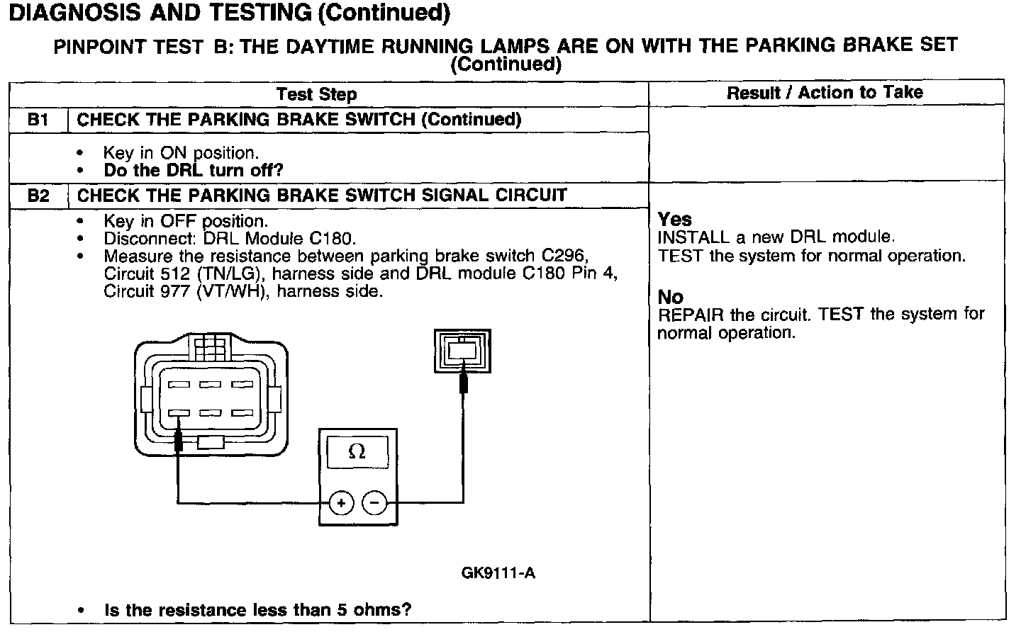 PINPOINT TEST B: THE DAYTIME RUNNING LAMPS ARE ON WITH THE PARKING BRAKE SET