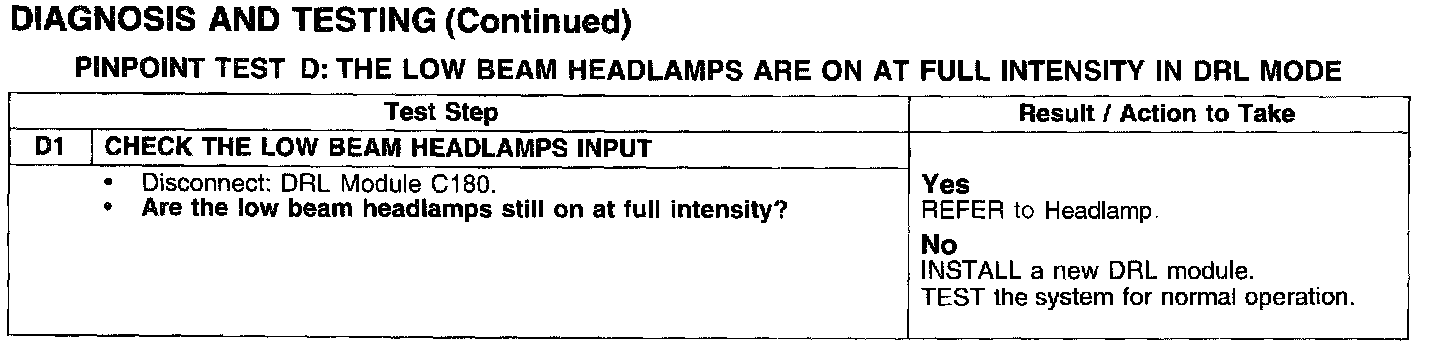 PINPOINT TEST D: THE LOW BEAM HEADLAMPS ARE ON AT FULL INTENSITY IN DRL MODE