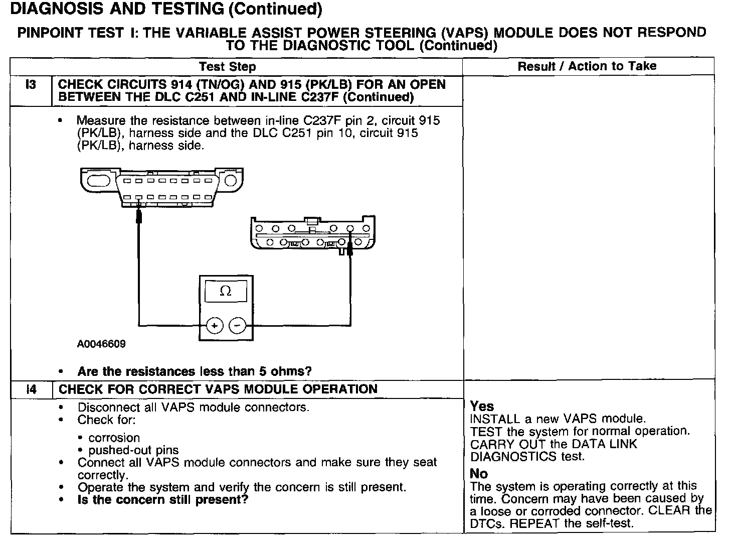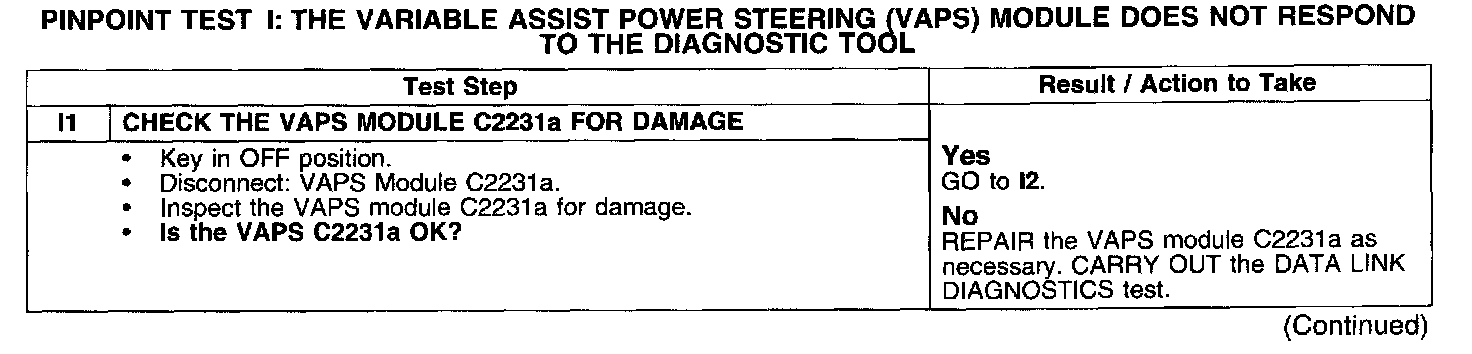 PINPOINT TEST I: THE VARIABLE ASSIST POWER STEERING (VAPS) MODULE DOES NOT RESPOND TO THE DIAGNOSTIC TOOL