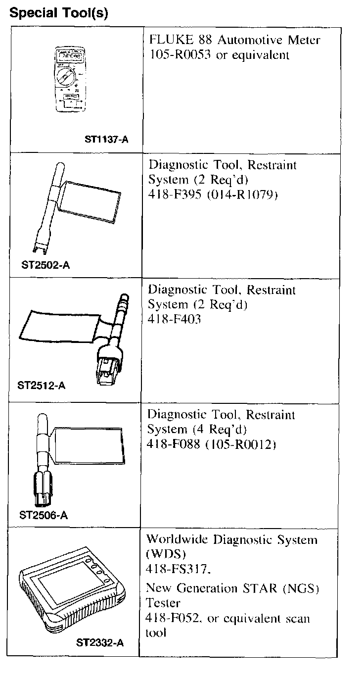WARNING: RESTRAINT SYSTEM DIAGNOSTIC TOOLS ARE FOR SERVICE ONLY. TOOLS MUST BE REMOVED PRIOR TO OPERATING THE VEHICLE OVER THE ROAD. FAILURE TO REMOVE RESTRAINT SYSTEM DIAGNOSTIC TOOLS COULD RESULT IN INJURY AND POSSIBLE VIOLATION OF VEHICLE SAFETY STANDARDS.
