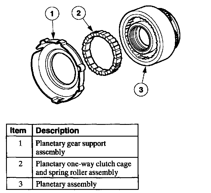 The planetary (low) one-way clutch is a roller clutch that holds the planetary gearset in first gear, (D) and D ranges. During automatic coasting downshifts into first gear ((D) and D ranges), the planetary one-way clutch freewheels so there is no engine braking.