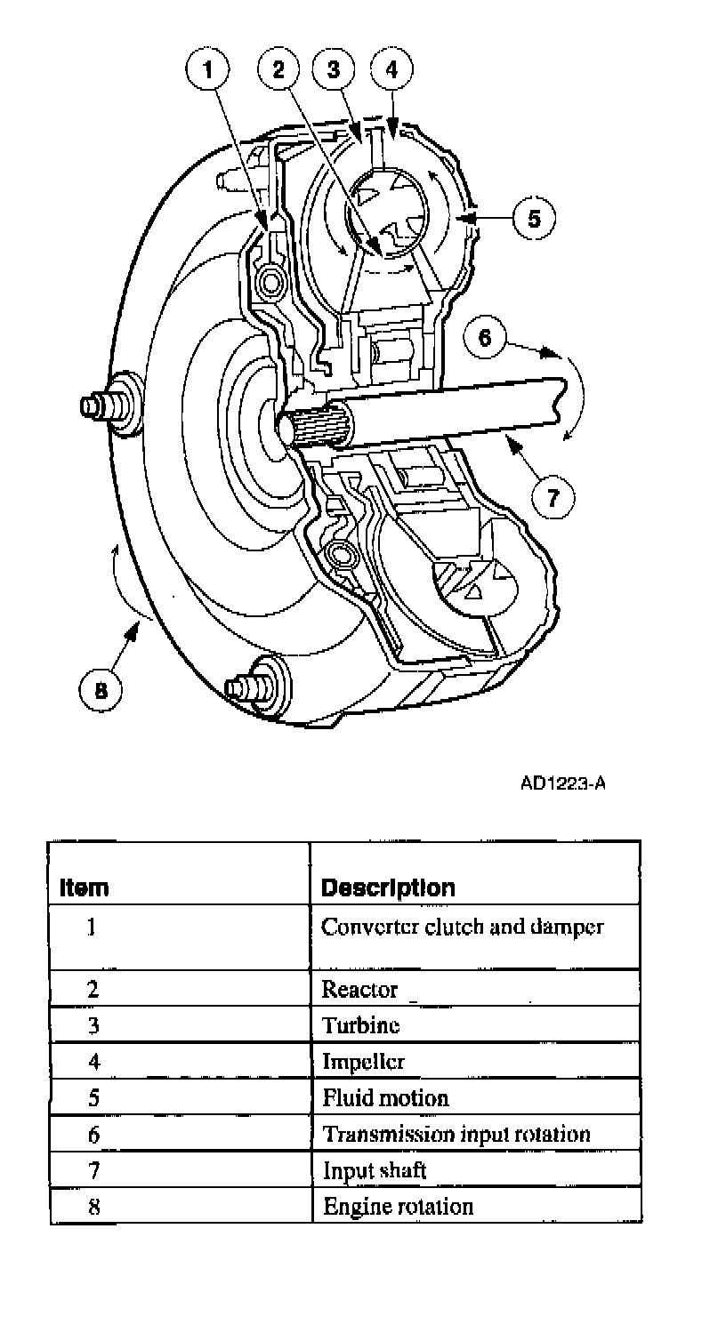 The torque converter transmits and multiplies torque. The torque converter is a four-element device: