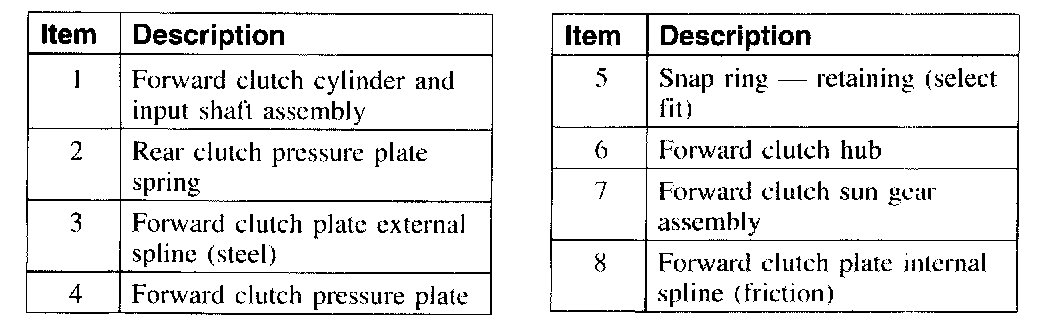 The forward clutch couples the forward clutch cylinder and input shaft to the forward sun gear in first, second, and third gears. The forward clutch is not applied in fourth gear.